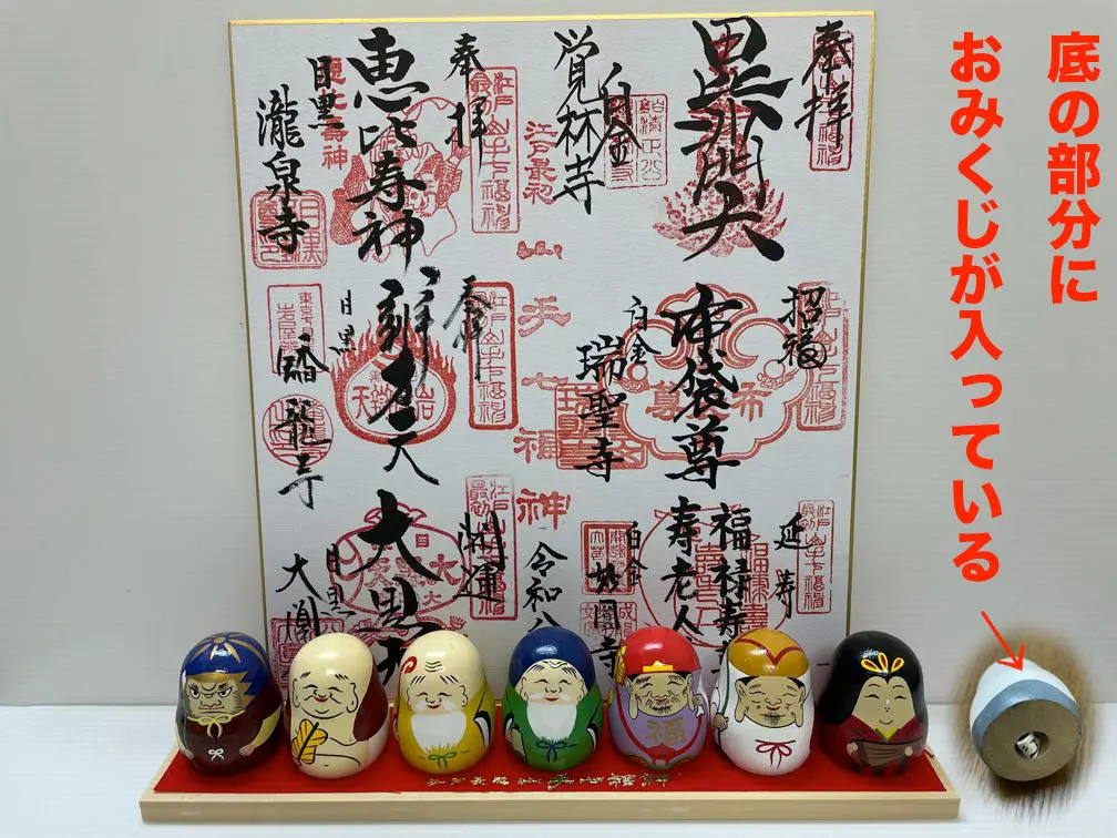 なお、今回いただいた御朱印(色紙)と七福神の達磨(おみくじ付き)です。