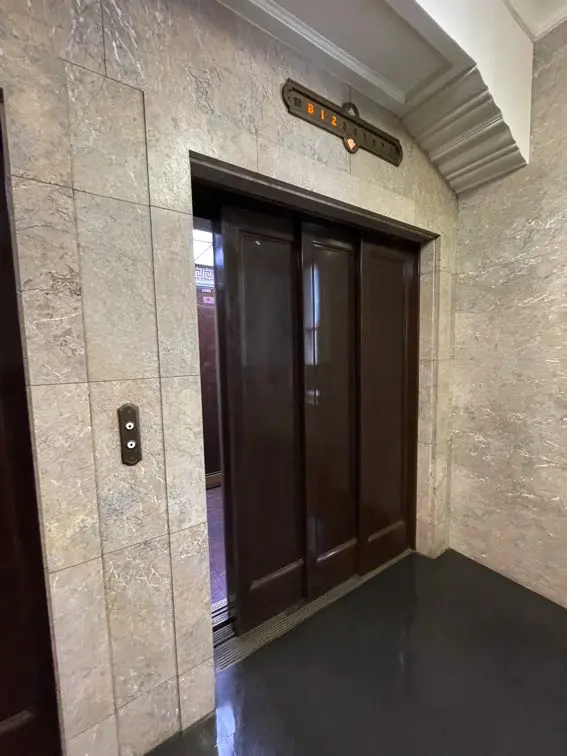 (扉が閉まるのも、現在のエレベーターと違いワンテンポ遅く、また閉まる音も重厚な音)